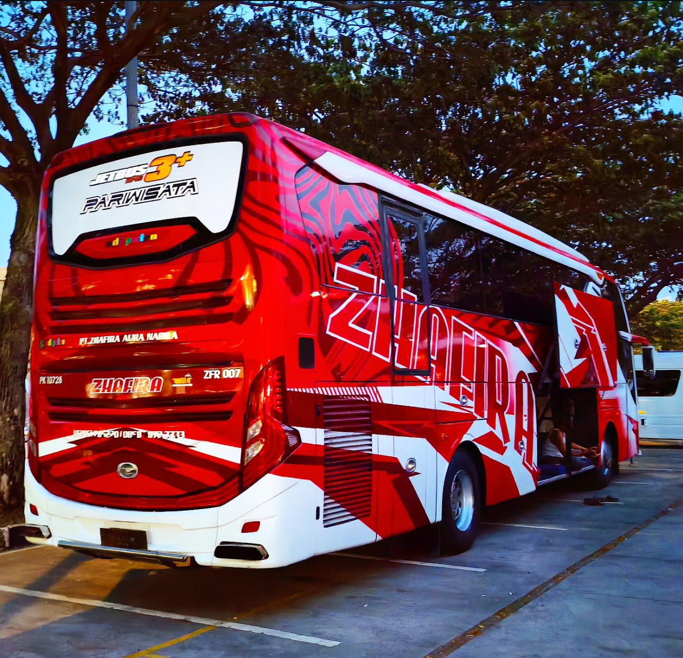 Muat koper besar rombongan 50 orang. Ruang bagasi bawah dan rak kabin atas.